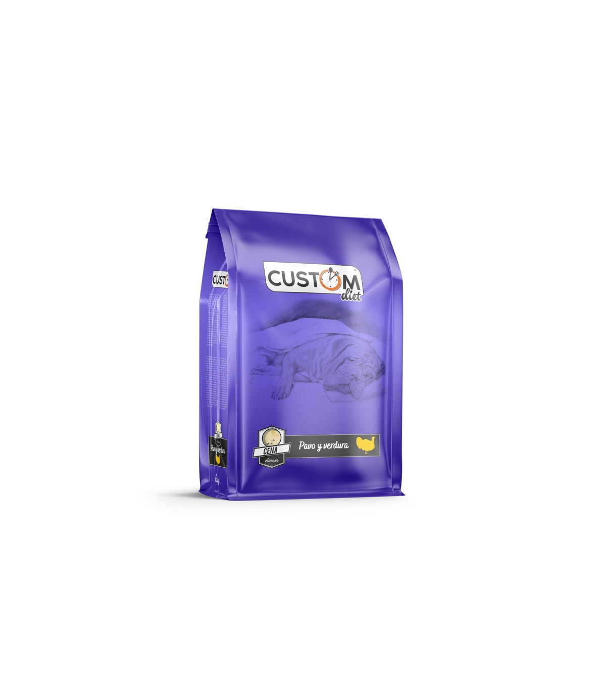 El alimento CUSTOM CENA PAVO VERDURA 6KG ofrece una nutrición natural con más del 70% de proteína de origen animal. Libre de cereales, su fórmula incorpora carne fresca de pavo (55%), pavo deshidratado (16%), patata, guisantes, levadura de cerveza, y aceite de salmón rico en Omega 3. Este alimento también contiene una variedad de ingredientes beneficiosos como zanahoria, manzana, extractos vegetales y prebióticos para apoyar la salud digestiva de tu mascota. Proteína 22%, Aceite y grasas brutas 10.5%, Fibra bruta 3.5%, Materia inorgánica 7%, Calcio 1.5%, Fósforo 1.2%, Humedad 10%.