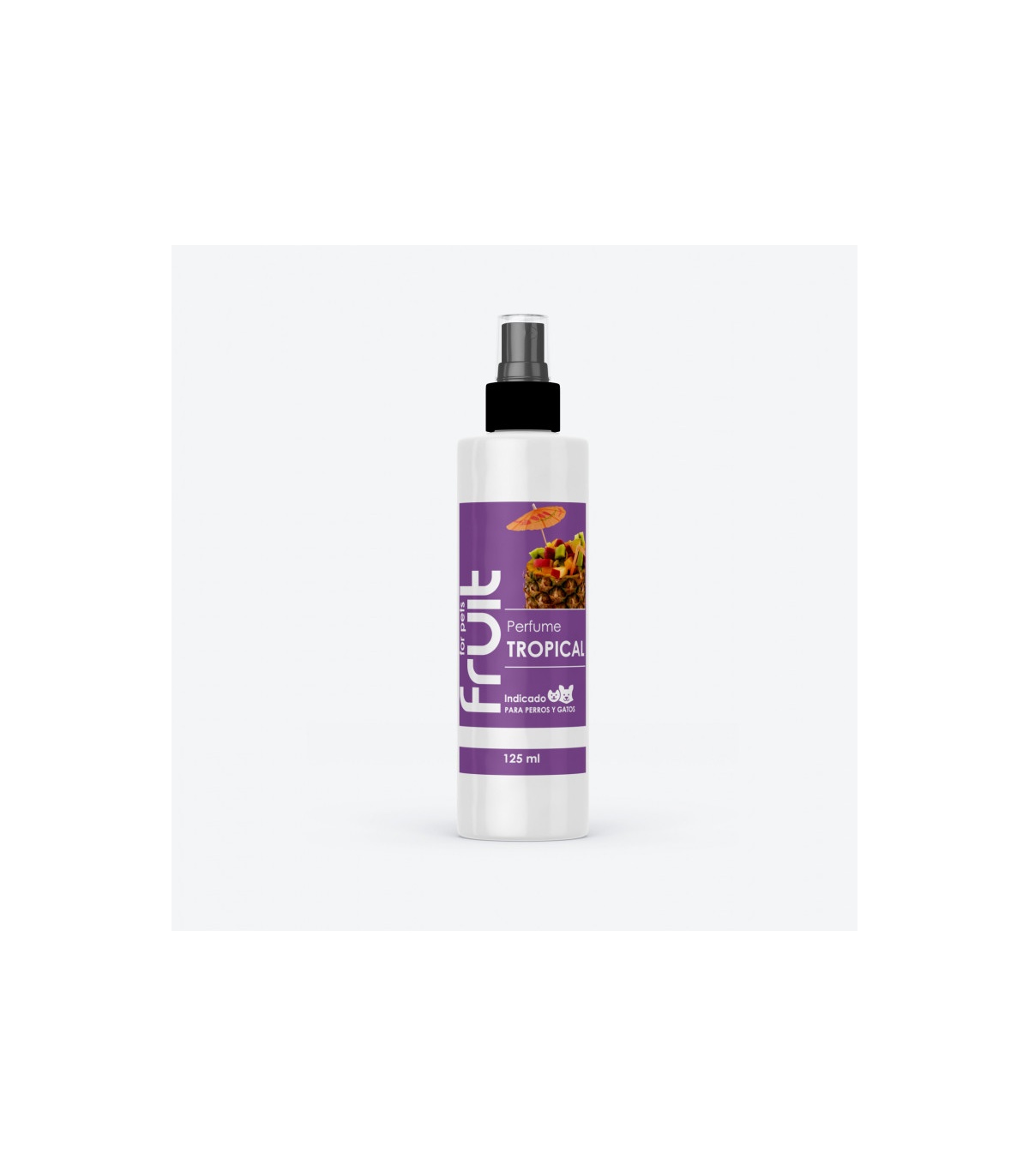 Perfume tropical para mascotas con aromas de frutas y flores, apto para perros, gatos y más.