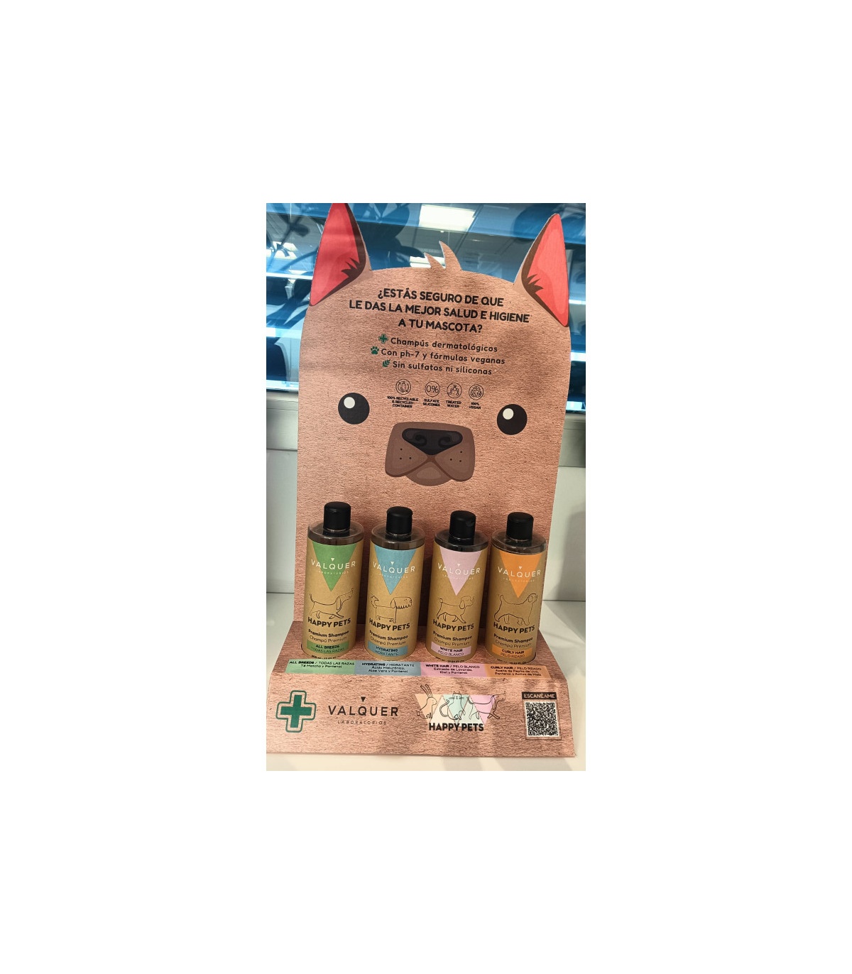 El expositor Happy Pets Champú es la solución perfecta para el cuidado del pelaje de tus perros y gatos. Ofrece una fórmula avanzada que garantiza limpieza y brillo, respetando la piel de tus mascotas. Ideal para tiendas y salones de belleza animal.
