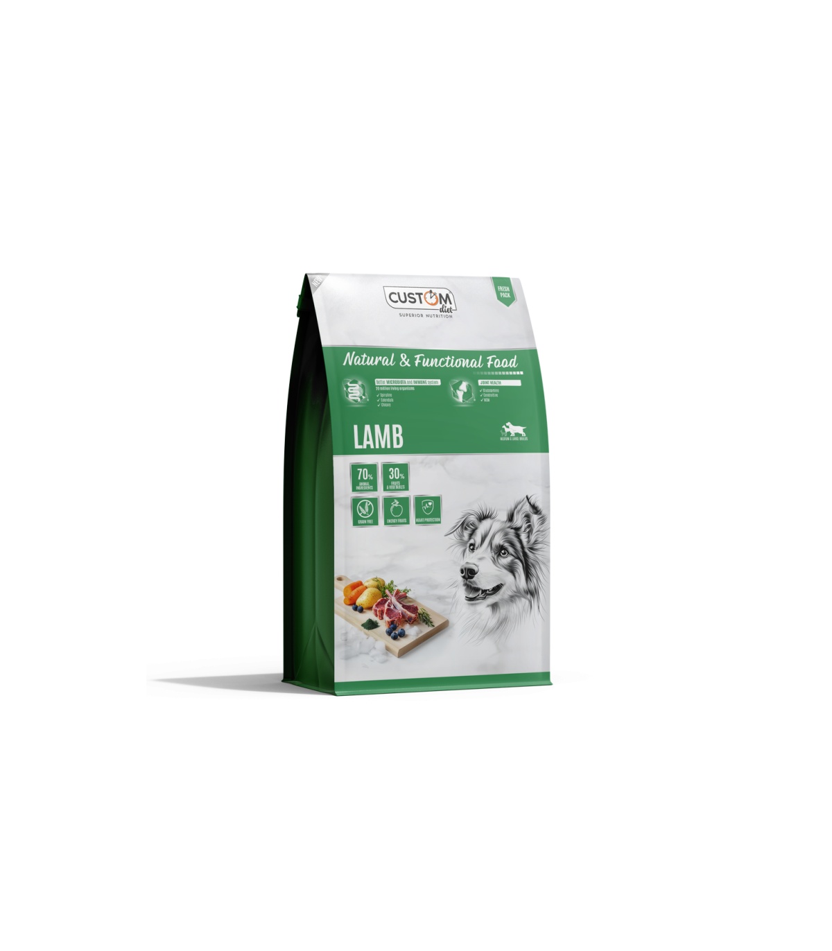Custom Diet Lamb es una dieta de alta gama diseñada para perros con paladares exigentes o digestiones sensibles. Al combinar cordero deshidratado (45%) con pato fresco (13%), esta receta ofrece una fuente de proteína rica en aminoácidos esenciales y muy fácil de asimilar. Su fórmula sin cereales previene intolerancias y proporciona una energía constante para mantener la vitalidad de tu perro.