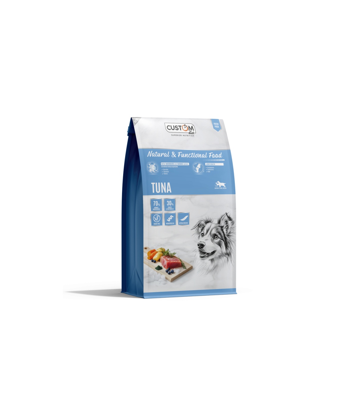 Custom Diet Tuna es una receta excepcional elaborada con una selección de pescados azules deshidratados (Atún, Anchoveta, Melva y Albacora). Esta fórmula 100% natural y sin cereales es rica en ácidos grasos Omega 3, lo que no solo garantiza una piel sana y un pelo brillante, sino que también apoya la función cognitiva y reduce la inflamación. Es la opción ideal para perros con alergias a las carnes terrestres o digestiones sensibles.