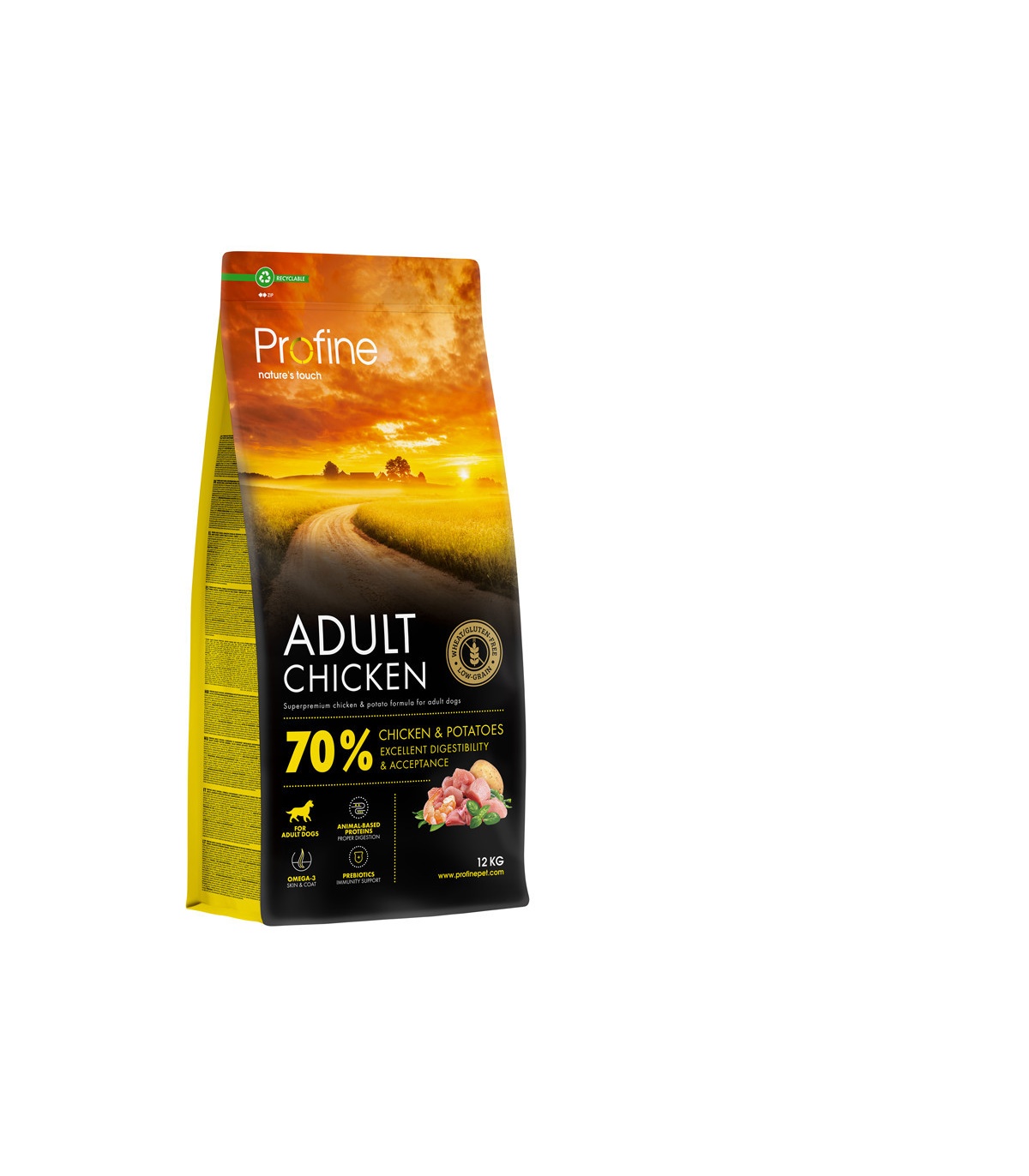 Alimento completo para perros – composición: pollo 45% (pollo secado 25%, harina de pollo 20%), maíz, grasa de pollo (conservada con tocoferoles mezclados, fuente de vitamina E) (12%), patatas (11%), manzanas secadas, levadura de cerveza, hígado de pollo hidrolizado (2%), gambas (1,5%), aceite de salmón (1%), algas marinas (0,5%), sulfato de glucosamina (0,025%), raíces de achicoria (fuente de manano-oligosacáridos 0,02%), mezcla de hierbas (hinojo, albahaca, salvia 0,02%), fructo-oligosacáridos (0,015%), extracto de yucca schidigera (0,015%), sulfato de condroitina (0,015%).