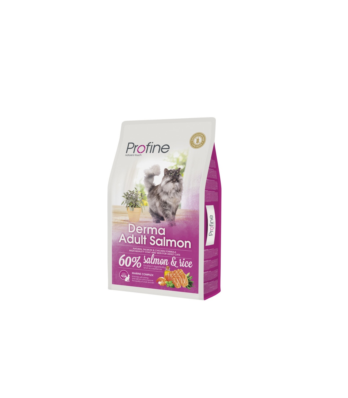 Alimento completo para gatos – composición: salmón deshidratado (42%) (salmón triturado 24%, proteína de salmón 18%), pollo deshidratado, arroz (15%), maíz, grasa de pollo (conservada con tocoferoles mezclados), aceite de salmón (3%), hígado de pollo hidrolizado, manzanas deshidratadas, levadura de cerveza, algas marinas (0,5%), mezcla de hierbas (hinojo, albahaca, salvia 0,02%), raíces de achicoria (fuente de manano-oligosacáridos 0,02%), fructo-oligosacáridos (0,015%), extracto de yucca schidigera (0,08%).