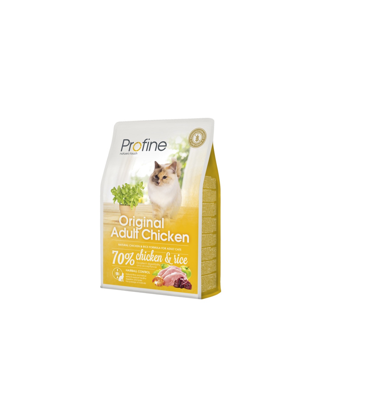 Profine Cat Original es un alimento nutritivo para gatos adultos. Su receta especial a base de pollo y arroz protege la piel y aporta un mayor brillo al pelaje. Es un alimento formado por ingredientes especiales para la nutrición natural de tu gato. Además, aporta energía y facilita la digestión, siendo ideal para gatos con complicaciones alimentarias o problemas intestinales.