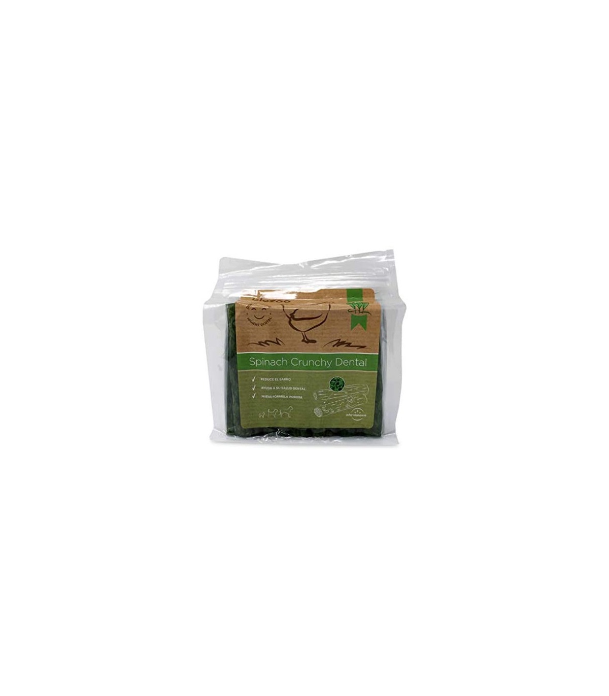Snack dental crujiente con espinacas ideal para la salud bucal de perros y gatos.
